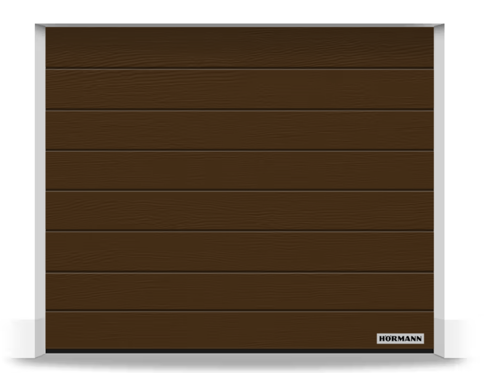 Brama segmentowa Hörmann RenoMatic 2440 × 2080 mm – przetłoczenia M, Woodgrain, kolor brązowy RAL 8028 + prowadzenie Z
