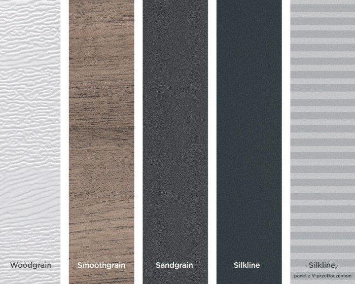 - Struktura zewnętrzna bram Wiśniowski Woodgrain (faktura 3D imitująca usłojenie, wysoka odporność mechaniczna)
