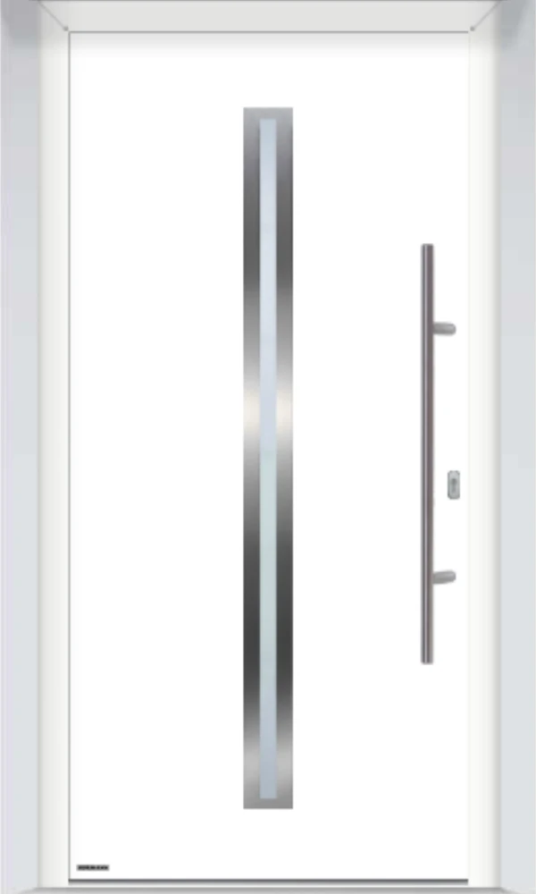 - Stalowa płyta drzwiowa z przegrodą termiczną, wypełnienie z utwardzonej pianki PU, grubość skrzydła 65mm