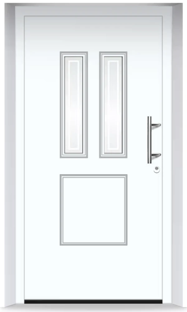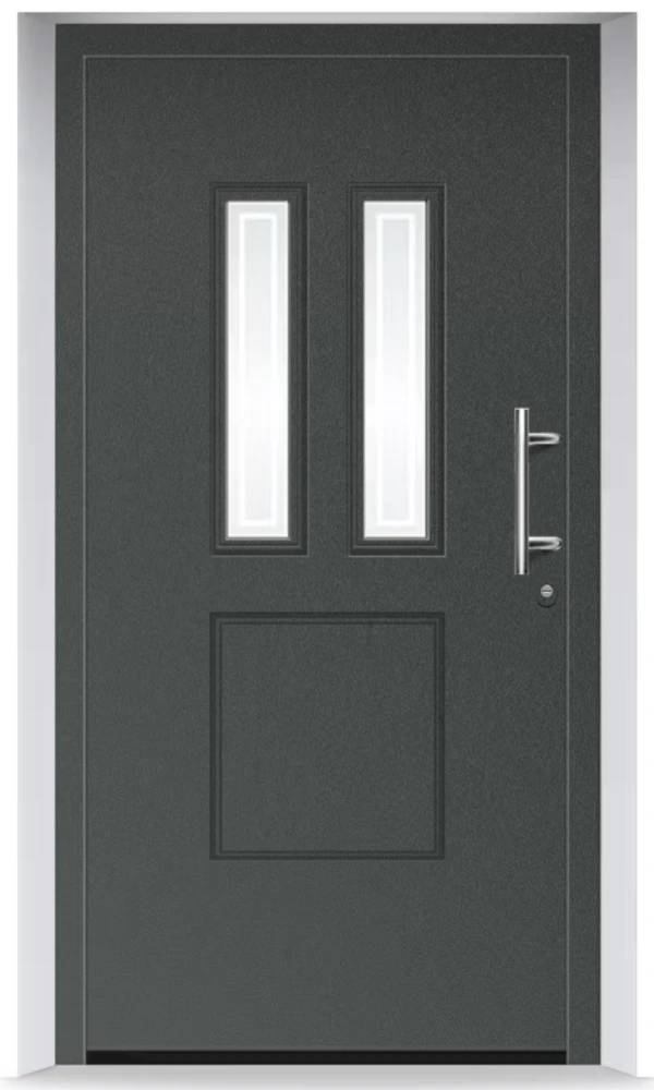 Seria Thermosafe charakteryzuje się nowoczesnym układem pionowych przeszkleń, które nadają drzwiom lekkości i elegancji. Wąskie, symetryczne pasy szkła doskonale komponują się z minimalistycznymi elewacjami i nowoczesną architekturą domów jednorodzinnych