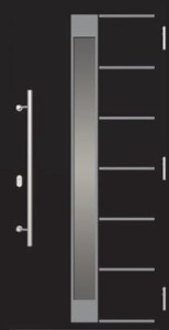 Drzwi zewnętrzne NOVA Wiśniowski wzór 025 z aplikacją jednostronną ze stali nierdzewnej - na około szyby , 7 pasków poziomych 15mm umieszczonych od strony zawiasów .Szyba dwukomorowa obustronnie bezpieczna 44.2//44.2 Ug=0,5 umieszczona pomiędzy blachami poszycia, na środku skrzydła. Blacha wewnętrzna z otworem pod szybę wpuszczaną, gładka.