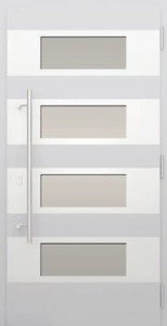 Drzwi zewnętrzne NOVA Wiśniowski wzór 029 z aplikacją jednostronną ze stali nierdzewnej na około szyb w standardowym wykonaniu malowaną w kolorze RAL mat struktura. Opcjonalnie można zastosować aplikacje ze stali nierdzewnej lub aplikacje w kolorze Decor. 3 szyby dwukomorowe obustronnie bezpieczne 44.2//44.2 Ug=0,5 umieszczone pomiędzy blachami poszycia, na środku skrzydła. Blacha wewnętrzna z otworem pod szyby wpuszczane, gładka.