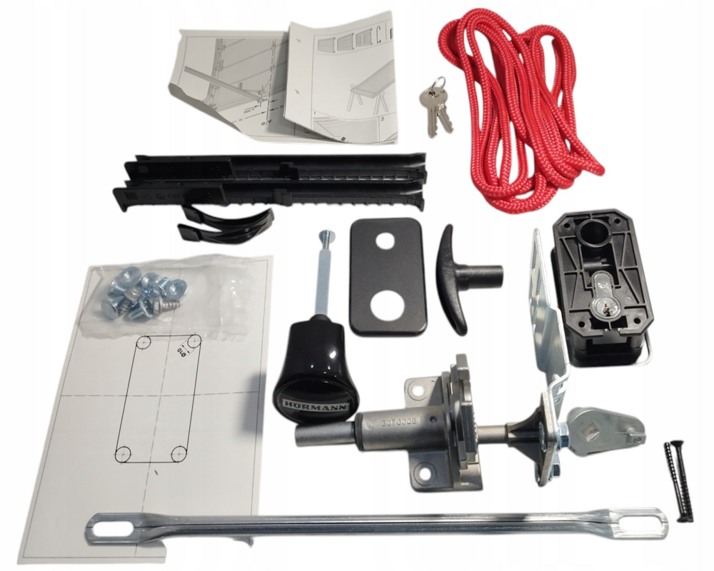 Kompletny zestaw okuć przeznaczony do ręcznej obsługi bram segmentowych Hörmann, stosowanych w instalacjach bez napędu elektrycznego. Zestaw umożliwia mechaniczne otwieranie, zamykanie oraz ryglowanie bramy za pomocą klamki i zamka cylindrycznego.