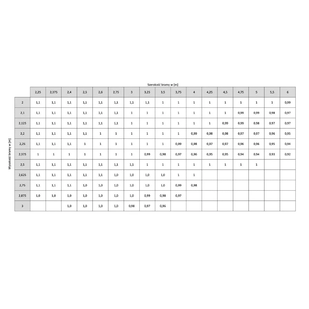 W zależności od wybranego typu prowadzenia i napędu minimalna wysokość nadproża może zaczynać się od 100 mm dla części konfiguracji automatycznych, natomiast w wielu układach ręcznych wymagane jest 200 mm. Maksymalny wymiar bramy wynosi 6000 mm szerokości i 3500 mm wysokości, a minimalne wymiary zależą od rodzaju prowadzenia; dla części konfiguracji producent podaje minimum 2000 x 1800 mm.