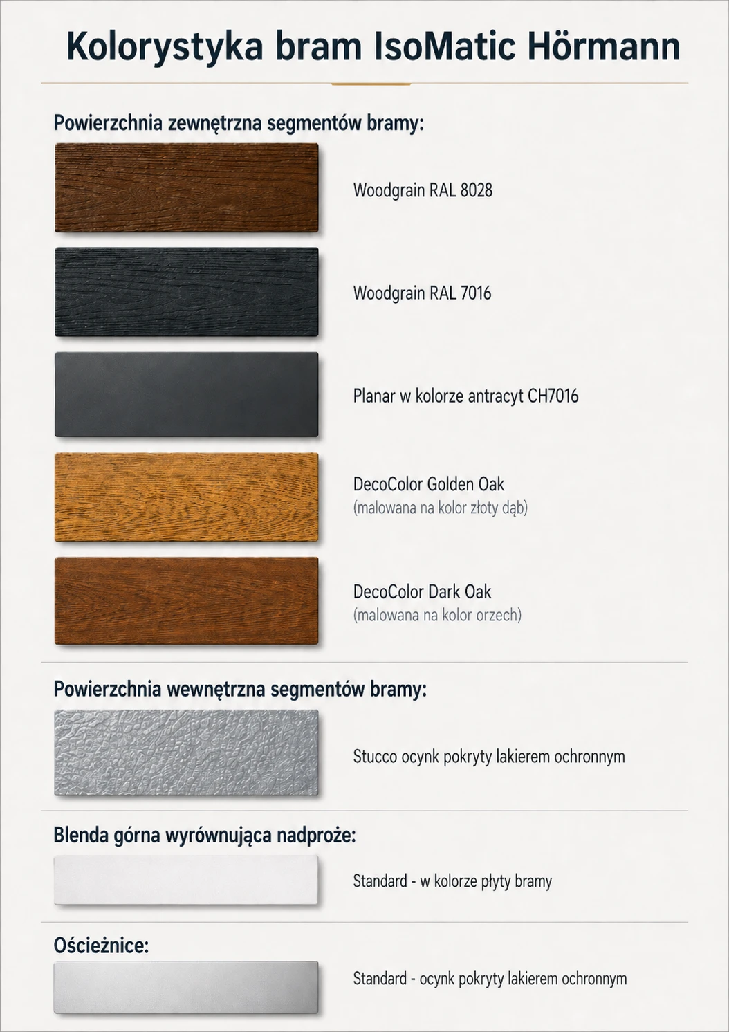 Model Hörmann IsoMatic dostępny jest w kilku wariantach wykończenia, dzięki czemu możesz wybrać wersję najlepiej pasującą do stolarki, elewacji, dachu lub bramy wjazdowej.